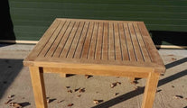 A very solid and substantial square teak garden table with a beautiful top.