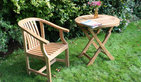 A practical round folding garden table in solid teak that can seat up to 4 of our wooden folding or dining chairs and is ideal for smaller terraces or gardens. Classic looking with a beautiful top manufactured with two attractive rows of teak slats and central bar all surrounded within a solid round teak frame. And of course as it benefits from a folding leg construction it is very compact and easy to store when not in use or put away for long-term winter storage.